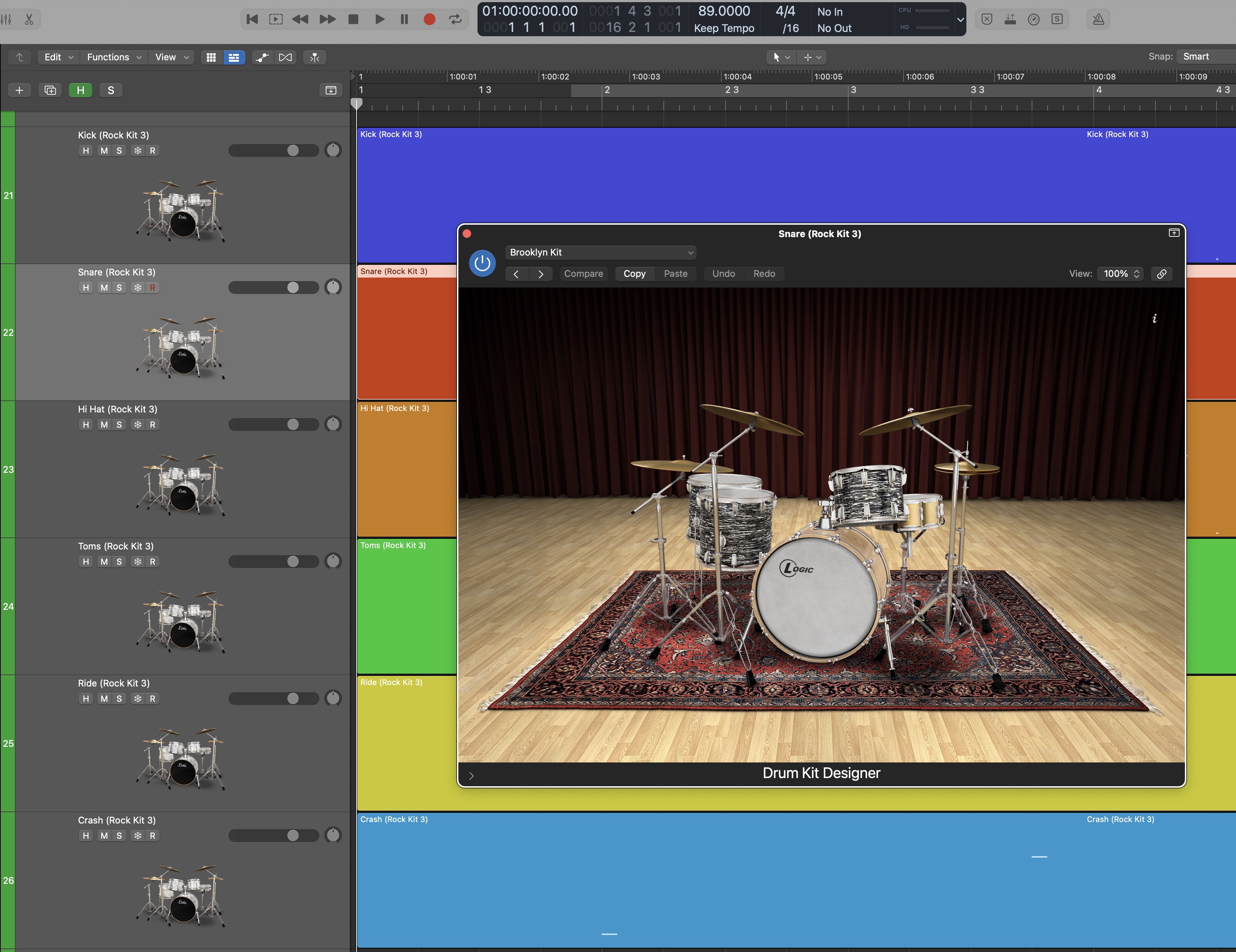 Built on Logic Pro 10.7.9. Newer versions of Logic Pro may display additional Drum Kit Designer controls not present in the original design — this won't affect the sound of the Auxeus Drums.
