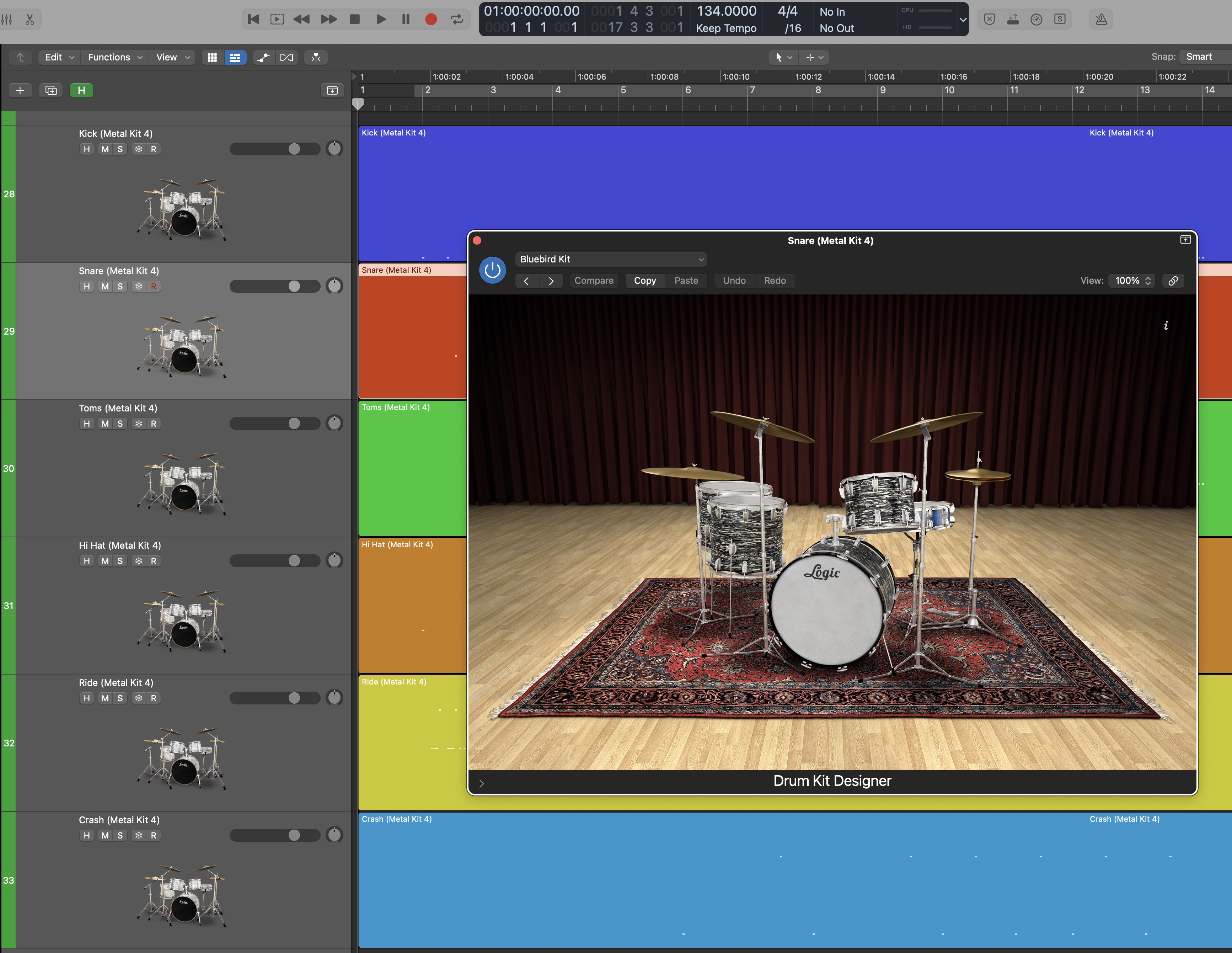 Built on Logic Pro 10.7.9. Newer versions of Logic Pro may display additional Drum Kit Designer controls not present in the original design — this won't affect the sound of the Auxeus Drums.